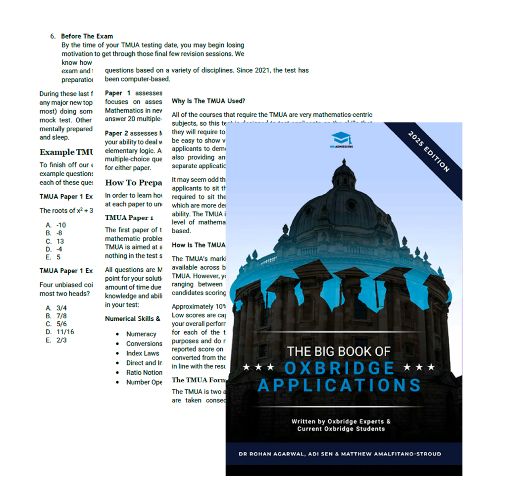 The Big Book of Oxbridge Applications takes the guesswork out of TMUA prep. The TMUA section of this free book gives you everything you need to understand the test and approach it with confidence. Inside, you’ll find: