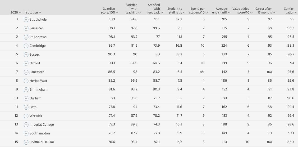Instead, we see that less well-known universities performed well in this list, including Strathclyde, Sussex and Heriot-Watt. St Andrews takes the top spot, which isn’t uncommon on ranking tables made by The Guardian.Â