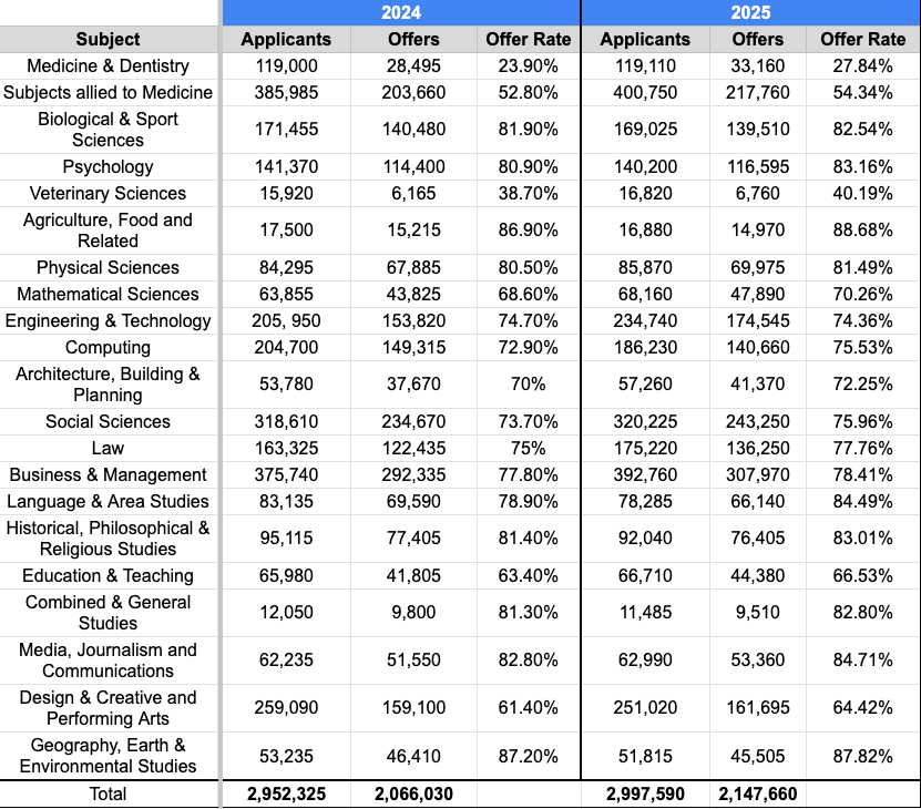 This information should help you make informed decisions, not discourage you. Choosing a degree is a significant investment, and your interests and long-term goals should always guide your choices. Competitiveness can be an indicator of future career opportunities, as many demanding degrees lead to respected, high-demand, or high-paying professions. Below you can find the full list of undergraduate subject areas in the UK alongside admissions data for both 2024 and 2025 (source: UCAS).
