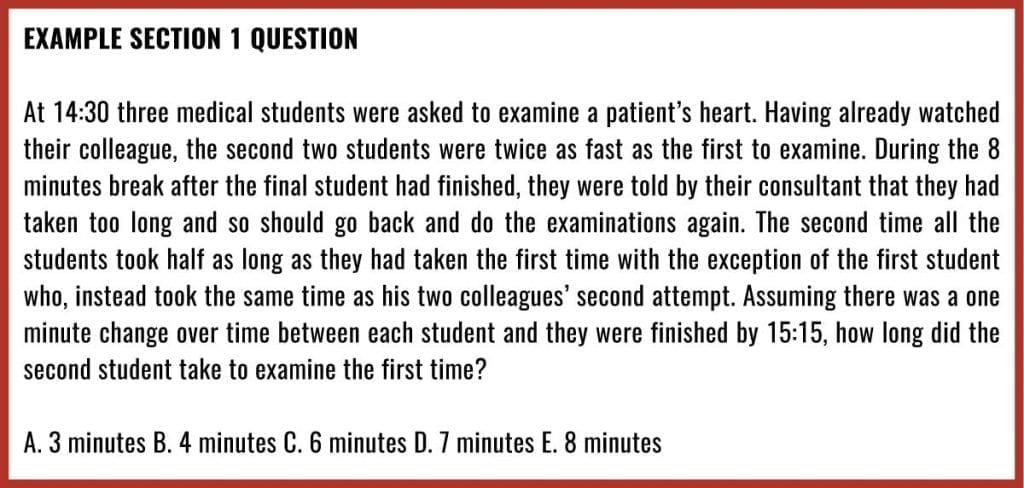 This section contains questions designed to catch you out, so you must be well prepared. Decision Making is important if you’re planning to become a doctor, as the role involves complex situations and difficult decisions. The subtest requires you to apply logic to make a decision, evaluate arguments, and analyse statistical information. You will need to answer 35 questions in 37 minutes.