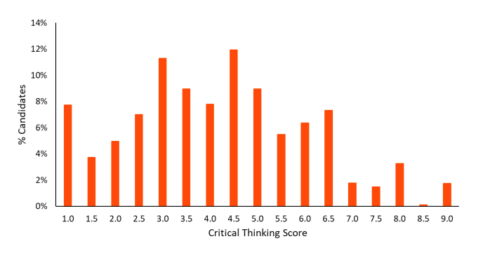 Critical thinking is a little bit of a different picture. Most common was 4.5 with just under 12% achieving it. But no one scored 7.5, which seems a little out of the ordinary for these kinds of subtests. Additionally, about 7% of applicants scoring 1.0, which is a much higher percentage than the Problem Solving section.